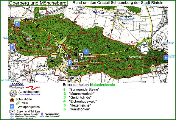 Oberhalb der Burg Schaumburg , die also der ganzen Region ihren Namen gab, ragt aus der langen, schmalen Kette des Wesergebirges der Möncheberg hervor. Sein Korallenoolith, ein Kalkstein, weckt die Begehrlichkeiten der Rohstofffirmen. Ca 130 Mill. Tonnen, die sich auf 190 ha Fläche erstrecken, sollen hier abgebaut werden. Erschreckend ist das Ausmaß des geplanten Kraters, der etwa vier Kilometer lang, einen Kilometer breit und bis zu 100 Meter tief würde.Die Menschen fürchten sich vor den Begleiterscheinungen, die sie in der Umgebung vielfach vor Augen haben: Die Propagandisten dieses Vorhabens appellieren sehr geschickt an das Gewissen der Bürger, doch ja nicht vor lauter Eigennutz die Interessen der Allgemeinheit aus den Augen zu verlieren, die mit denen der Unternehmen identisch seien. Das Material sei unentbehrlich für die Bauwirtschaft und den Straßenbau im gesamten norddeutschem Raum, bei längeren Anfahrtswegen entstünde auch mehr Umweltbelastung, und außerdem schaffe man etwa 30 Arbeitsplätze. Mit dieser Logik kann man natürlich ganz Deutschland plattmachen. Die örtlichen Politiker werden mit der Aussicht auf Gewerbesteuer gelockt, außerdem bringt der Verkauf des Landes, dass größtenteils Staatsforst ist, mehr ein, als die Forstleute jemals erwirtschaften könnten. Wenn das Vorkommen ausgebeutet ist, soll renaturiert werden. Wir schaffen Natur aus zweiter Hand, so die jeweiligen Antragsteller. Doch wie man sich dieses bei den verbleibenden Steilwänden vorstellt, ist rätselhaft. Es gibt nur Negativbeispiele in der näheren Umgebung. Doch diese Argumente sind leicht zu widerlegen. Es ist nämlich so, dass die Absatzmärkte gar nicht mehr in der Region liegen, sondern weit ab. Jede Menge Baumaterial kann man aus Skandinavien holen, bzw. aus vorhandenen schon genehmigten Steinbrüchen und brauchte nicht in unserem dicht besiedelten Land noch verbliebene landschaftsprägende Naturschönheiten für alle Zeiten zerstören. Eine andere Frage ist die Belastung der Atmosphäre durch Abgase und durch das Verschwinden von ganzen Wäldern, die hier eigentlich wichtige reinigende Aufgaben übernehmen. Eine Frage, die niemand beantworten kann. Mit dem Möncheberg würde auch ein wertvoller Lebensraum für seltene Tiere und Pflanzen vernichtet werden. Der ganze Berg liegt im Landschaftsschutzgebiet. Er ist zum kleineren Teil mit Nadelwald, zum größeren besteht er allerdings aus naturnahem Laubwald. Im Frühling blühen auf den Kammlagen u.A. Märzenbecher, Hohler Lerchensporn, Busch-Windröschen, Gelbes Windröschen, Gemeines Lungenkraut und Bärlauch. Als schützenswert ausgewiesen: An Tieren leben dort unter anderem seltene Fledermausarten und der Uhu. Einseitige Wirtschaftinteressen stehen auch hier gegen Naturschutzinteressen. Das LROP weist die letzten Berge der Wesergebirgskette als Vorsorgegebiet für Rohstoffgewinnung aus. (Der Kamm des Wesergebirges wurde Ende 2003 zum Naturschutzgebiet erklärt) Schon einmal 1992/93 konnte dieser Wunsch auf Abbau des Möncheberges abgewendet werden, dank großer Proteste von engagierten Natur- und Heimatfreunden. Doch immer wieder, wie jetzt auch wieder 2002 gerät er in das Visier der Rohstoffindustrie und damit als mögliches Abbaugebiet für das Land, trotz Vorrang zur Trinkwassgewinnung und Erholungsnutzung, Wald- und Forstwirtschaft. Man will sich alle Optionen offenhalten und möchte die “vermeintliche” Lagerstätte Möncheberg vom Steinbruch Rohden aus (Dieser Steinbruch ist bereits ausgebeutet und müsste schon lange rekultiviert sein. Die letzte Karre wird allerdings deshalb nicht herausgefahren) erschließen. Der Möncheberg ist ein beliebtes Ausflugsziel für den gesamten Raum, aus dem nahegelegen Hannover wird er häufig angefahren. Ebenso wird er natürlich zur Erholung der Schaumburger genutzt. Auf dem Kamm liegt die Paschenburg, eine beliebte Anlaufstelle für Wanderfreunde und Natur- und Kulturliebhaber. Ein weit verzweigtes Wanderwegenetz durchzieht das gesamte Gebiet. Zu den Naturdenkmälern gehören z.B. das Meumekenloch unterhalb der Paschenburg. Dieser Teil des Berges hieß früher Osterberg. Noch heute zeugt der Name des Weges Osterstieg daraufhin, der sich auch gehalten hat. Hier bei der höchsten Erhebung des Möncheberges fanden die Osterfeuer zu Ehren der Göttin Ostara statt, die weit ins Land hinaus leuchteten. Die Paschenburg selbst, ist keine Burg im eigentlichen Sinn, sondern ein von Förster Kayser 1842 erbautes Gasthaus, welches in dieser Tradition auch weitergeführt wird. Diese Zuwegung zur Paschenburg würde durch einen geplanten Steinbruch ebenfalls aus dieser Richtung nicht mehr möglich sein. Die Passstraße würde ebenfalls verschwinden. Vorstellung von Dr. Jürgen Probst (Verein Schönes Rohden) und Elke Reineking (Schaumburger Freunde)